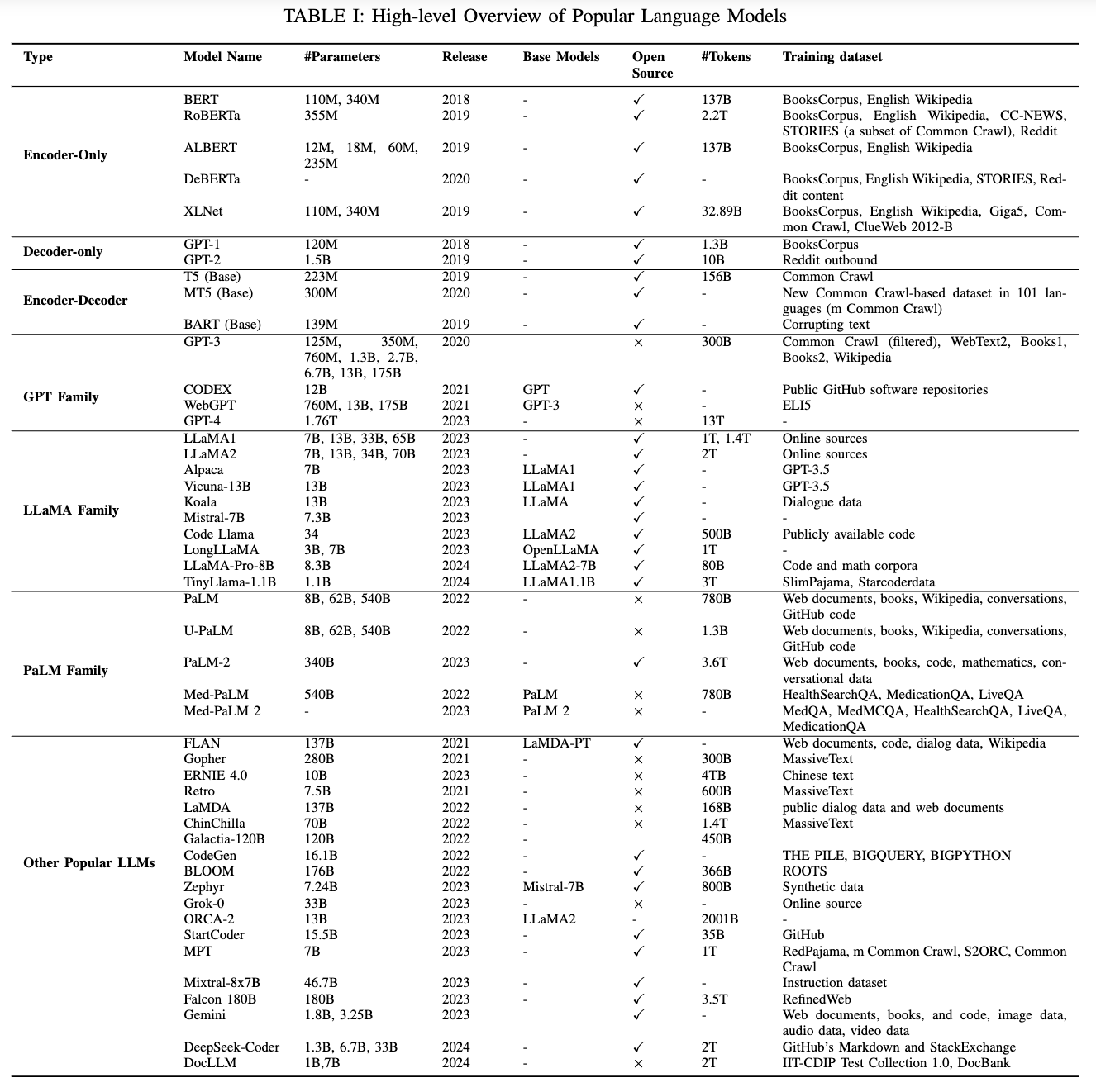 이 섹션에서는 LLM의 기반이 되는 초기 사전 학습 신경 언어 모델(Pre-trained Neural Language Models)을 검토하고, 이어서 GPT, LLaMA, PaLM이라는 세 가지 LLM 계열에 초점을 맞춰 논의한다. Table I은 이러한 모델들과 그 특성에 대한 개요를 제공한다.