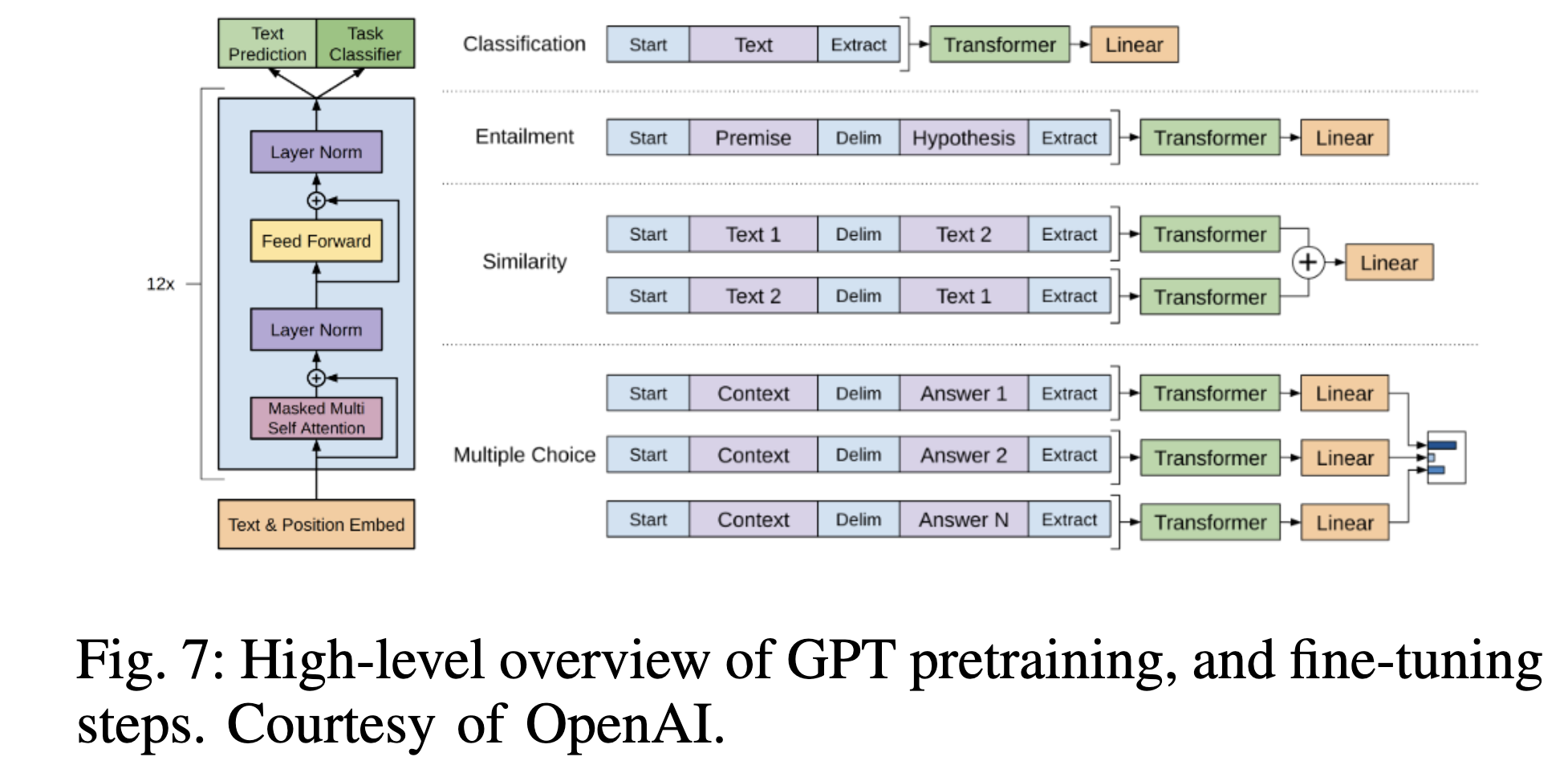 GPT-1 [50]은 디코더 전용 트랜스포머 모델을 다양한 라벨이 없는 텍스트 코퍼스에 대해 생성 사전 학습(Generative Pre-Training, GPT) 방식으로 학습하고, 각 특정 후속 작업에 대해 소량의 데이터로 판별 미세 조정(discriminative fine-tuning)을 수행하여 폭넓은 자연어 작업에서 좋은 성능을 얻을 수 있음을 처음으로 시연했다(Fig. 7 참조). GPT-1은 이후 GPT 모델 개발의 길을 열었으며, 각 버전이 아키텍처를 개선하고 다양한 언어 작업에서 더 나은 성능을 달성했다.